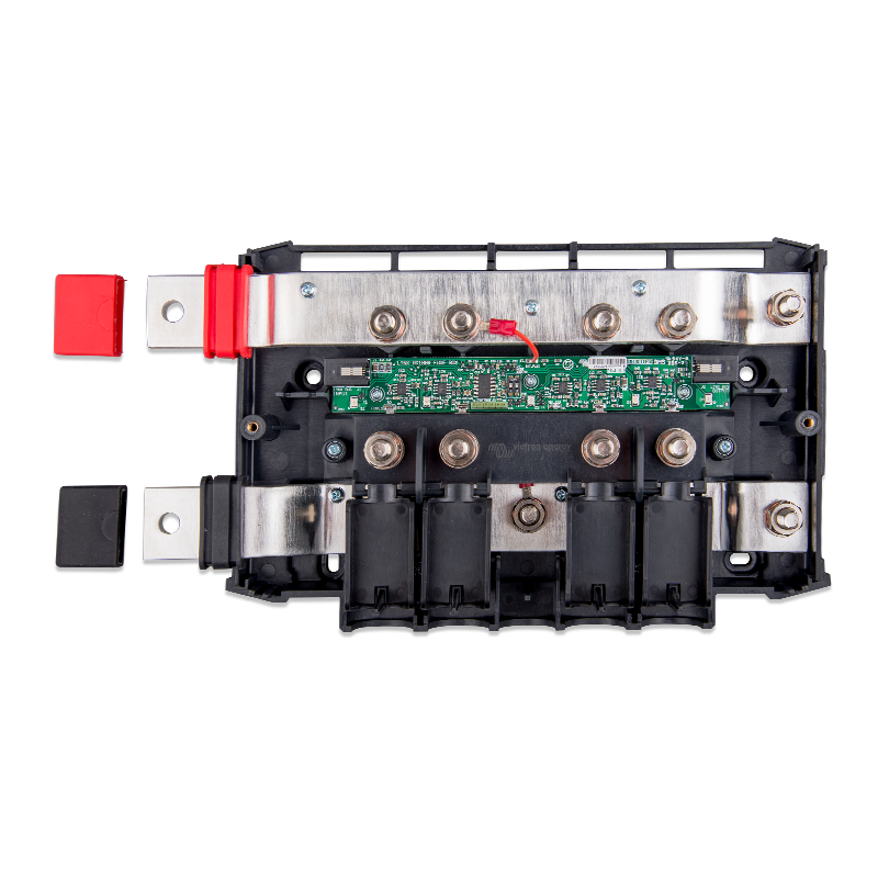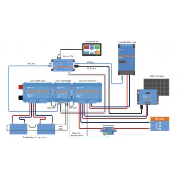 Se pot conecta direct invertoarele fotovoltaice d ela Victron Energy și se pot adaga protectii prin siguranțe mega-fuse.
