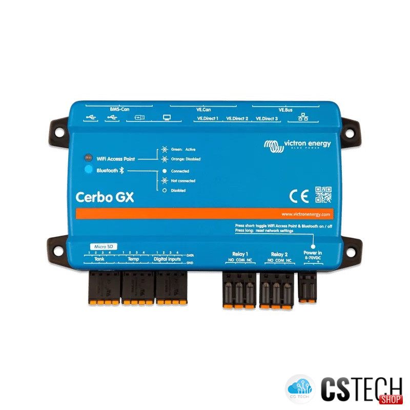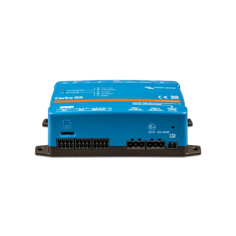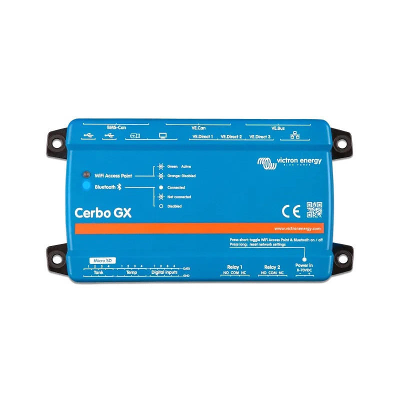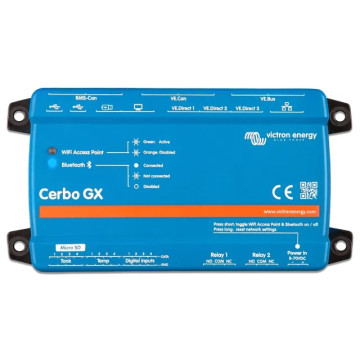Cerbo GX poate fi montat cu ușurință și poate fi montat și pe o șină DIN-Rail cu ajutorul adaptorului DIN35 mic (nu este inclus). Ecranul său tactil separat poate fi înșurubat pe un tablou de bord, eliminând necesitatea de a crea decupaje perfecte (ca în cazul Color Control GX). Conectarea este ușoară prin intermediul unui singur cablu, eliminând astfel grija de a aduce mai multe fire pe tabloul de bord. Bluetooth-ul permite o conectare și configurare rapidă, prin aplicația noastră VictronConnect.